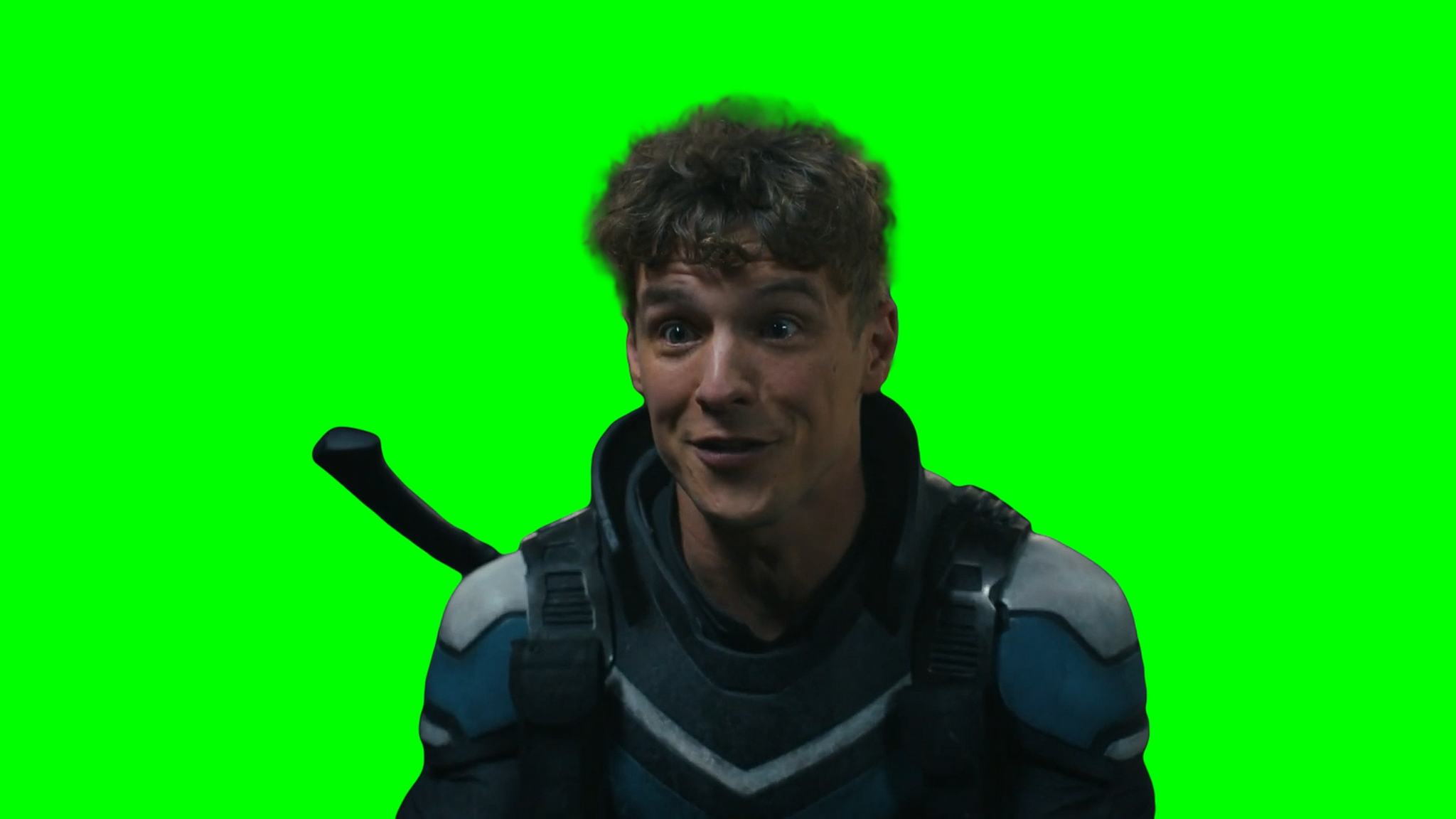 Green Screen Meme Template of Adrian Chase meeting the alternate dimension version of him and saying "ARE YOU FUCKING KIDDING ME?!" and gets excited. They also recreate the Spider-Man Pointing meme